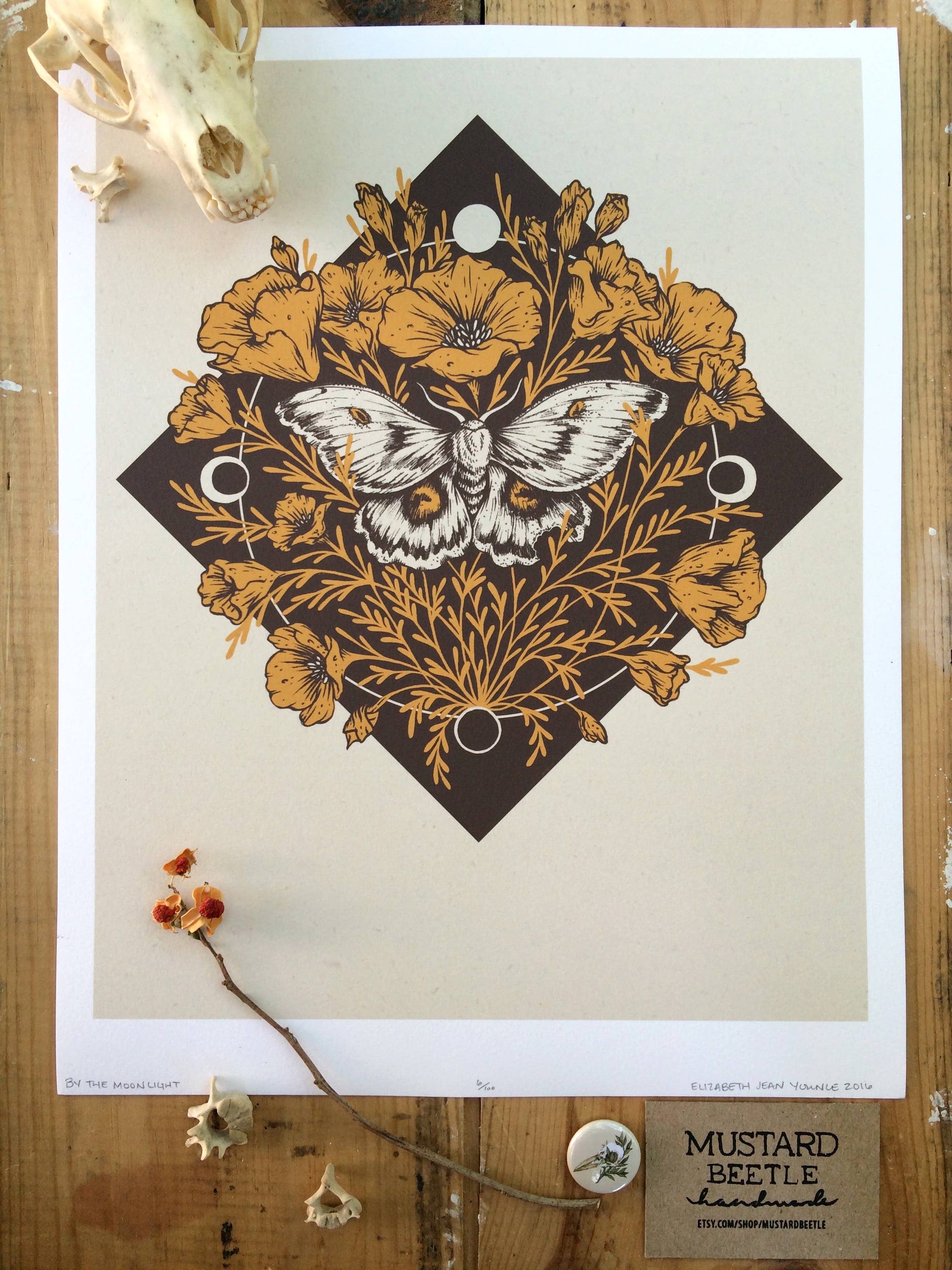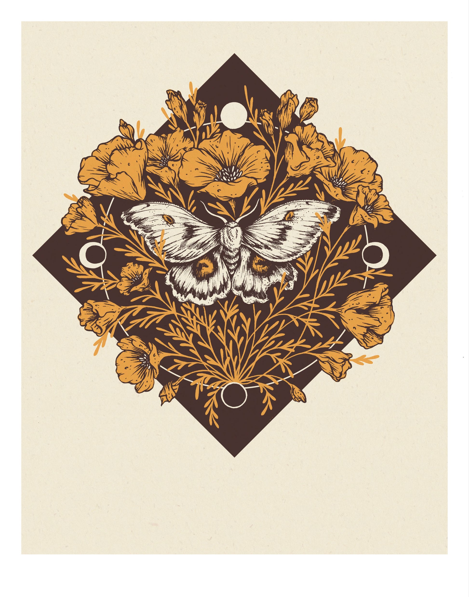 Moth & Poppies, Moon Phases, Giclee Print 11x14"